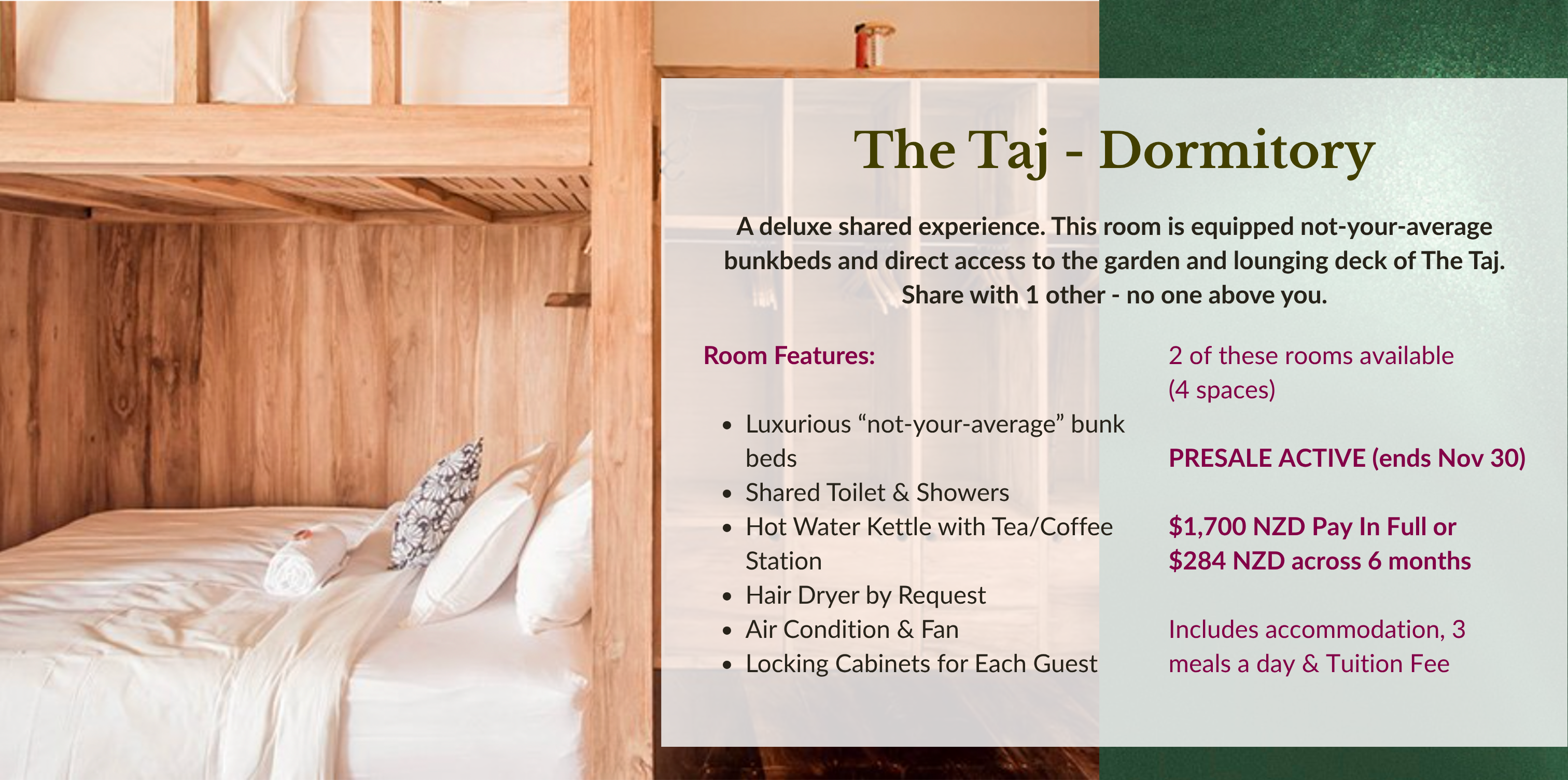 Yes! Once you sign up you'll be locked into an automatic, monthly payment plan. It is your responsibility to make sure there's funds at the same time each month. The sooner you sign up, the lower each monthly payment will be (all outstanding amounts need to be paid before the retreat starts). If you wish to pay in full, please reach out to either Melly or Samantha directly for bank details.